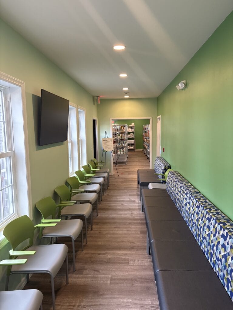 The majority of the first floor is dedicated to a food pantry. The long hallway leading up to the space serves as a waiting area. It has a cheerful ambiance highlighted by bright colors and is lined with comfortable chairs and benches on either side. The pantry itself offers an experience that prioritizes dignity, accessibility, and community connection for those in need. It is expected to serve over 2,000 individuals each year and allows enrolled families to schedule an appointment to pick up both shelf-stable and fresh, nutritious food.