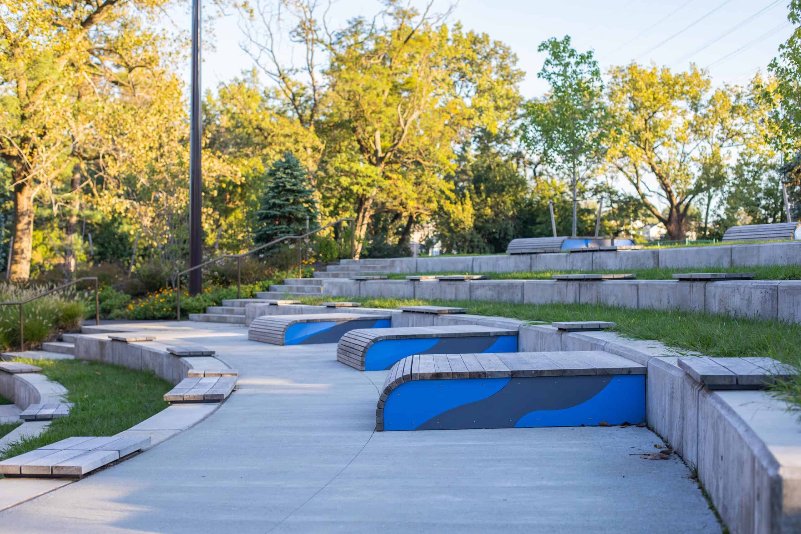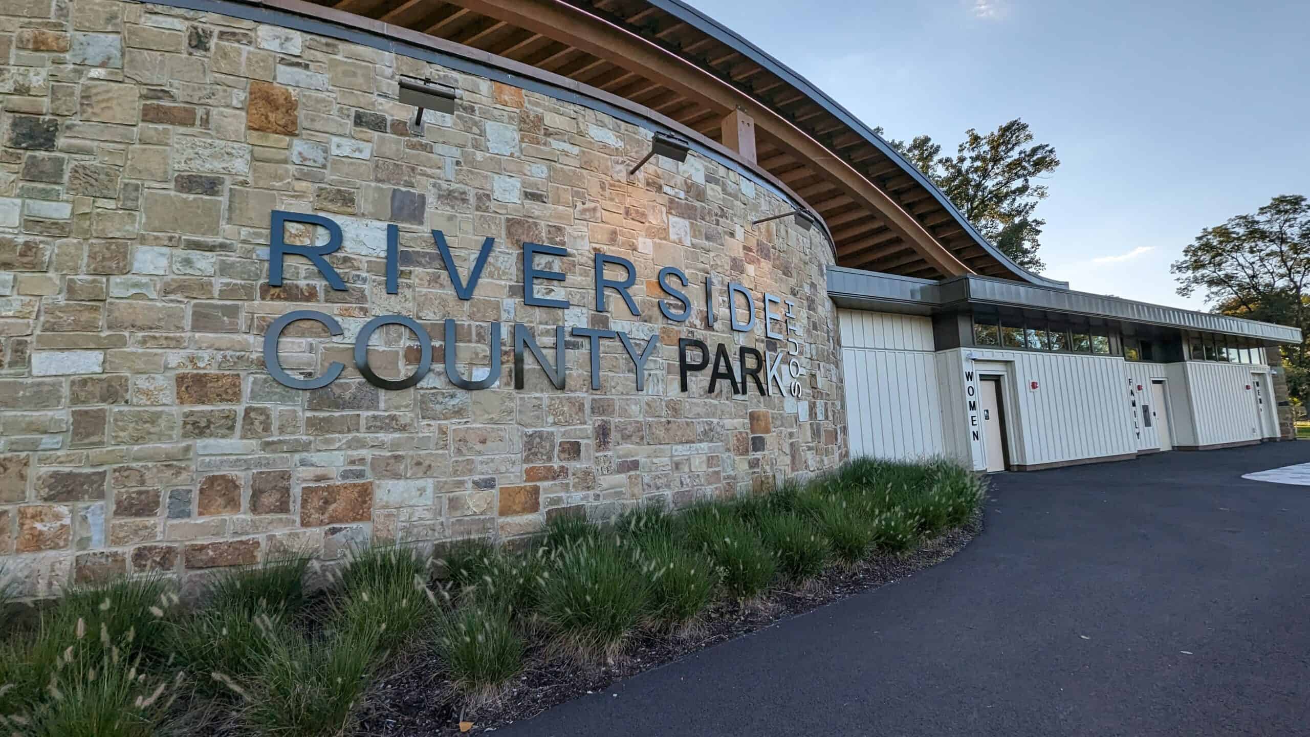 As visitors enter the park, they are greeted by the welcome signage on the comfort station, creating a new destination and meeting point. Connected by a curvilinear stone spine, a stage is located on the riverside with a new amphitheater nestled into the hill, while the restrooms remain accessible to visitors along the path. Providing shade while aiding in the overall acoustics, an artistic roof structure further connects the programmatic elements and the structure to the landscape. The design also focused on enhanced security within the restrooms with threat detection systems, vandal resistant finishes, and accessibility and inclusivity for all users with the “family” restroom located between the two gendered restrooms. The comfort station also features clerestory lighting for ample natural light and an accessible chase to provide maintenance without shutting down the building.