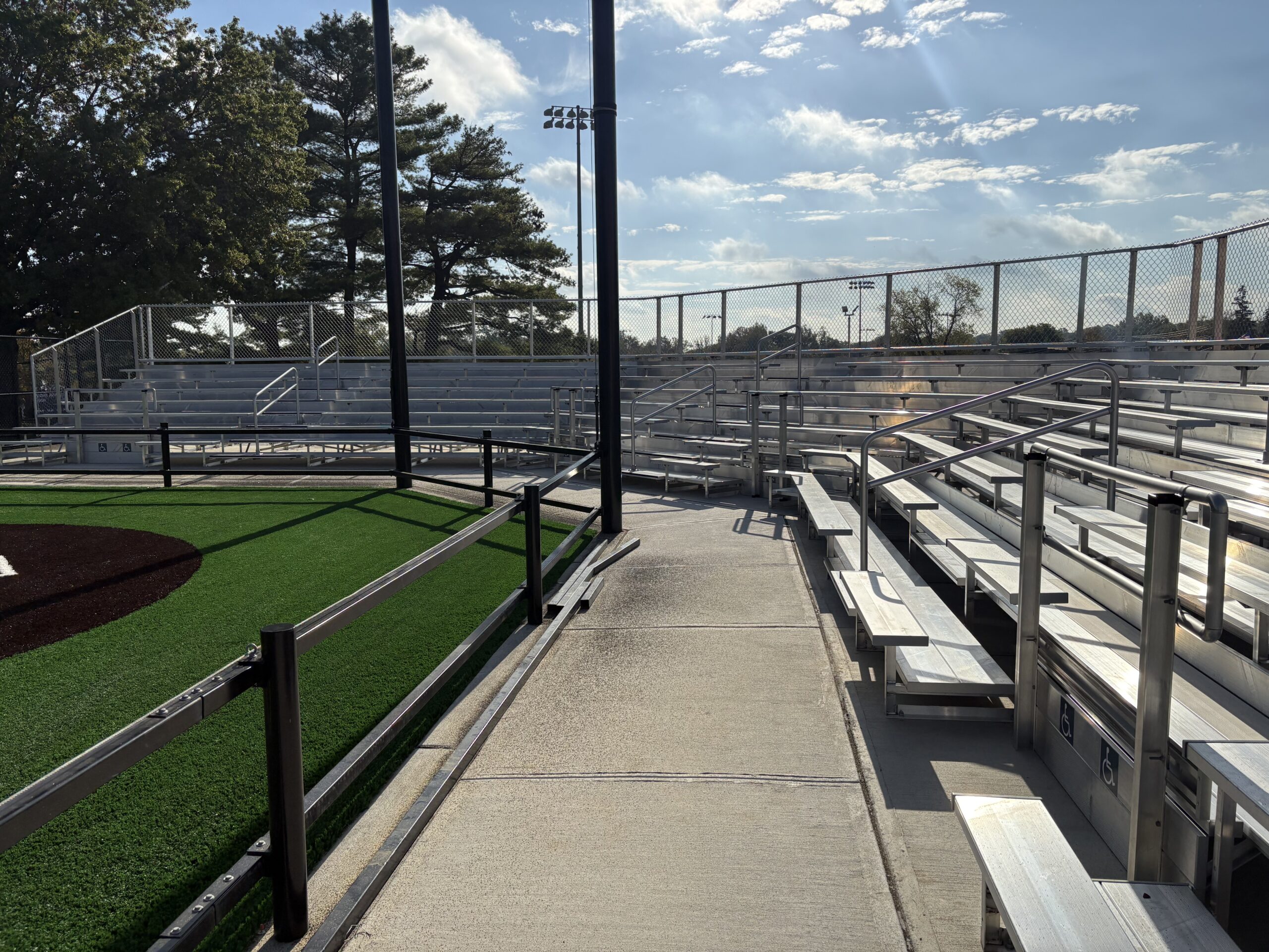 Following these efforts, the design team provided an expansive design that improved the area’s entrance and visitor experience and created a baseball/multi-sport field with lights for night games. Accessible access points were enhanced, including a new walkway leading to a post-game pavilion. This raised area features new, curved, mortarless block walls that navigate the change in grade, while also utilizing stamped concrete to highlight zones of interaction. Spectators are then guided to new bleachers, wrapping around home plate, along with new press box and restroom facilities, so all amenities are close at hand. New dugouts, bullpens, batting cages, scoreboards, and other necessary improvements were also designed.